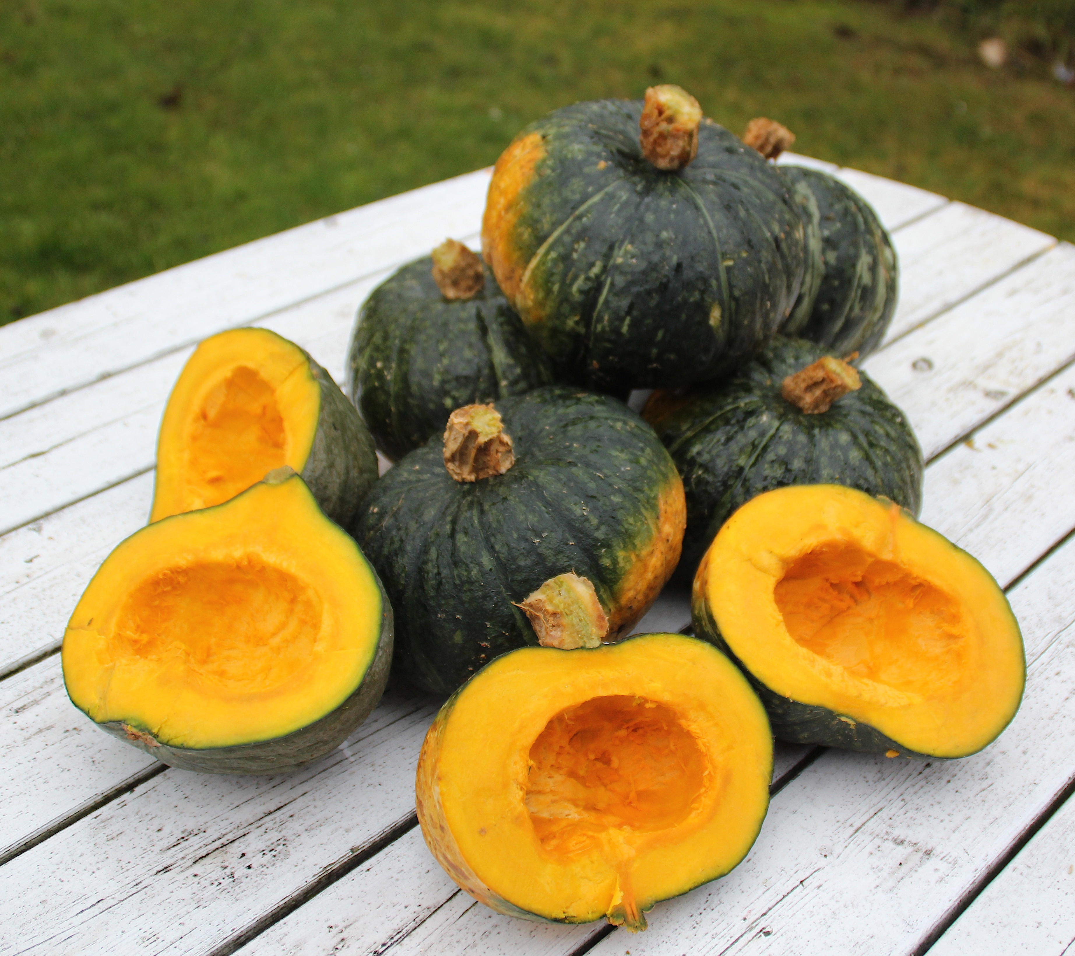 Yields a smallish really dark-green fruit for long time storage. It belongs to the kabocha-group and has flattened round fruits. The flesh is a deep orange, quite free of fibres, medium dry with a strong, sweet flavour. It resembles yams quite a lot. Black Forest, normally, has 3-4 fruits/plant with big seeds. A portion has about 8 seeds. MOFGA-certified seed. See under Info etc. - Ecologically grown seeds.