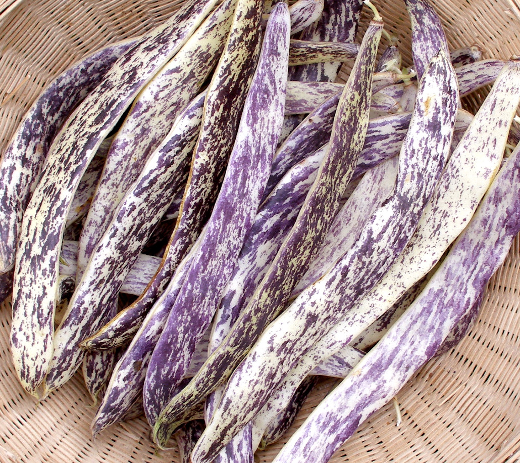 Dragon's Tongue, is an unusual and very beautiful golden wax pod from Holland. The compact sturdy plants yield large amounts of long, flattened round pods with no fibre. They are a delicious creamy yellow with purple spots and tiger stripes which disappear in cooking. Harvest often and enjoy the pods fresh or slightly poached. Dragon Langerie is an old sort keeping its place as one of the tastiest of beans. It is resistant to bean rust. The seed is purple-brown in colour with blue stripes. MOFGA-certified seed. See under Info etc. - Ecologically grown seeds.