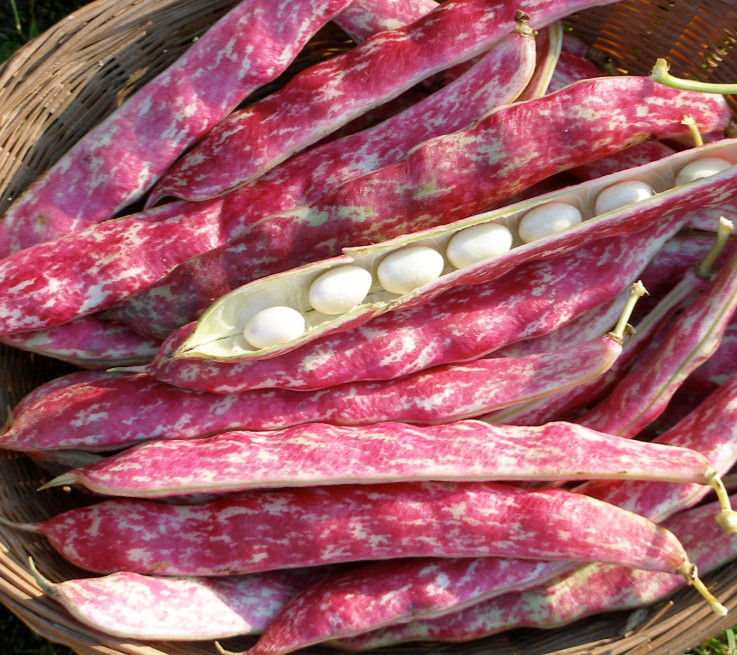 Is the only bean you need to grow really. It yields tender quite light-green, flattened round 13 cm long beans without fibres, early. A week or so later the thick unripe seeds are ready for harvest. The pods are shelled and the beans boiled until tender (10 min.), a nutritious delicacy with butter and herbs. After another few weeks the ripe beans are ready for threshing and winter storage. This plant is sturdy, quite tall and very fruitful. Borlotto is a true "fire tongue" with very red-speckled pods when fully ripe. This is a fast, very uniform, useful shelling bean. The seed is white-yellow with wine-red patterns. A portion contains about 50 seeds.